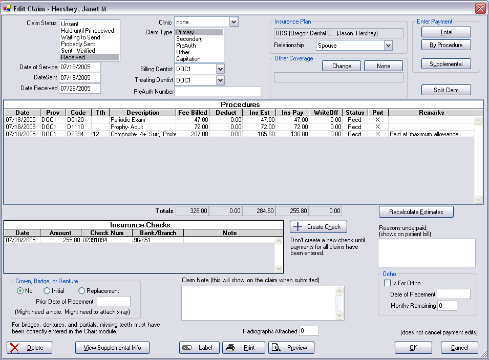 You can print or preview the claim directly from the Claim window by clicking one of the buttons at the bottom, but it is much more common to just click OK, leaving the claim status as 'Waiting to send'. Then, it will show in the Claim Send window where the claims can be printed or sent electronically as a batch at the end of the day.