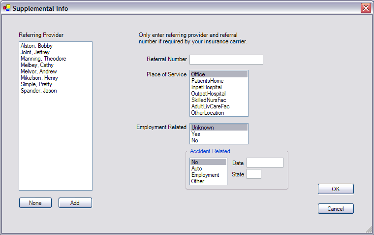 These are fields that are used rarely, so they are hidden to prevent clutter. They are for special insurance situations. If you don't know what they are for, you can just leave them as they are. All referral sources will show on the list above, and you will be able to select the referring provider from the available choices or add a new referral. See the Referral section for more information.