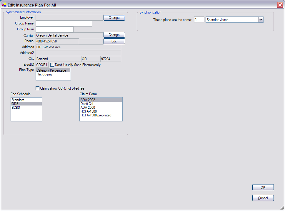 The screen above may not look exactly the same as yours if your Easy features are set differently. In the screenshot above, the Medicaid and Capitation features are turned off. Any changes in this section will affect all Insurance Plans that are listed in the Synchronization section at the upper right. The user interface for changing Employers and Carriers is a little bit more complex than in the Insurance Plan window, but it gives you more control as well.