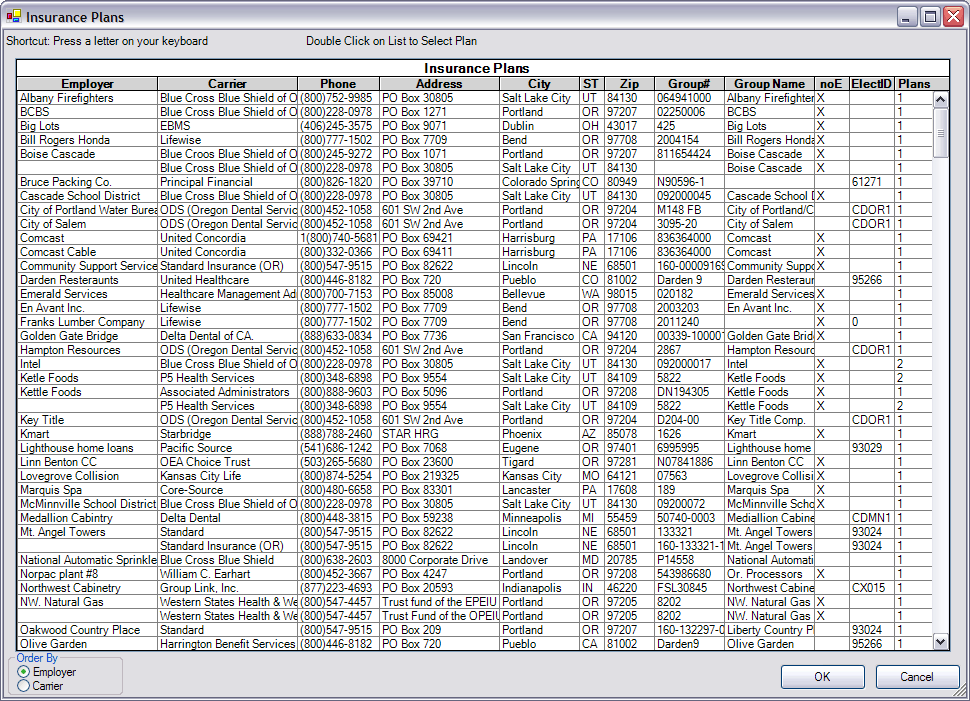 You would not normally need to view this list since it can be quite long and confusing to look at. But when a patient doesn't bring an insurance card, it can come in handy because you can look up the insurance by Employer. This list is also available from the Insurance Plan edit window so that you can assign a plan from the list to a patient.