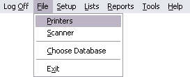 In the File menu, you can access the Printer setup, Scanner setup, and the Choose Database window: