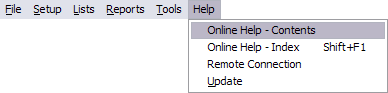 Online Help is available from the first two items in the Help menu. Remote Connection is used to allow us access to your computer for assistance and troubleshooting. Update lets you check for and download newer versions.