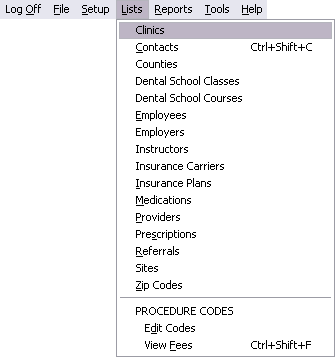Lists include Clinics, Contacts, Counties, Dental School Classes and Courses, Employees, Employers, Instructors, Insurance Carriers, Insurance Plans, Medications, Providers, Prescriptions, Referrals, Sites, ZipCodes, and Procedure Codes.