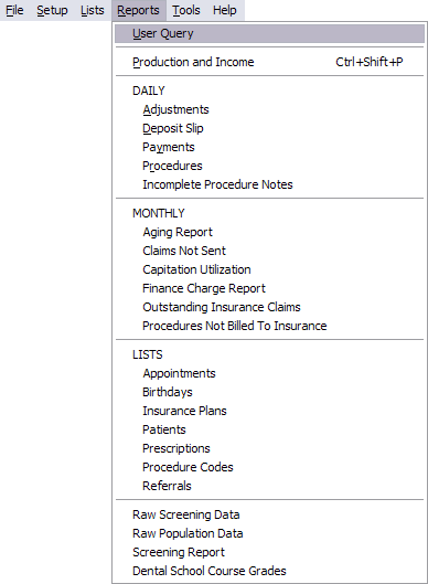 In the Reports menu, you can perform a User Query, which is a kind of custom report for advanced users. The Production and Income report is the most important and most frequently used report. There are also a variety of other premade Reports, including Daily Reports and Monthly Reports. Population and screening reports are part of Public Health. Dental School Course Grade report is only for Dental Schools.