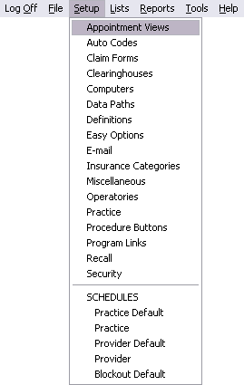 In the Setup menu, you can set up Appointment Views, Auto Codes, Claim Forms, Clearinghouses, Computers, Data Paths, Definitions, Easy Options, E-mail Setup, Insurance Categories, Misc Setup, Operatories, Practice info, Procedure Buttons, Program Links, Recall settings, and Security. Schedule setup includes the Default Schedules for Practice, Provider, and Blockout. It also contains a Daily Schedule for Practice and Provider.