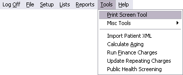 Tools include the Print Screen Tool, Misc Tools ( Check Database Integrity, Telephone Numbers, and Import Patient From Textfile), Import Patient XML, Calculate Aging, Run Finance Charges, and Update Repeating Charges. Public Health Screening is only used in Public Health.