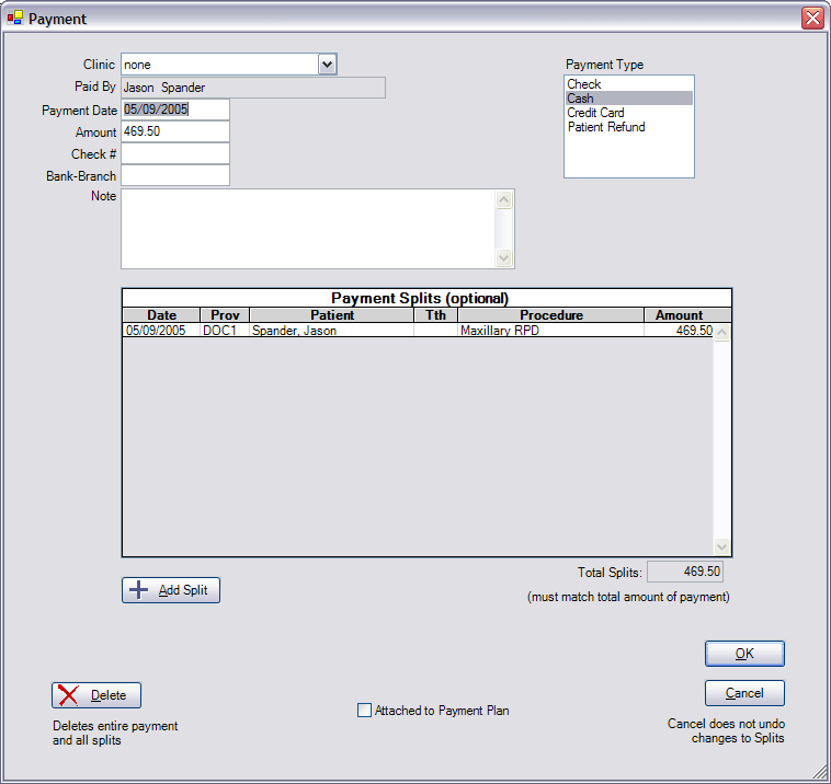 Sometimes you will need to split a payment between different patients, families, providers, dates, or procedures. If you do not need to split the payment, a split will be automatically created when you click OK, and you won't have to worry about it.