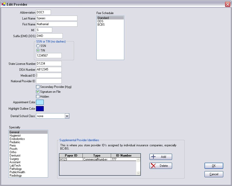 The fee schedule is the default fee (or the Usual, Customary, and Regular fee) for that provider.This is typically the fee schedule that will be assigned to new patients for that provider unless the patient has insurance, and then the insurance fee schedule is usually used. The secondary provider box would be checked if the provider is a hygienist because the primary provider would be the dentist.