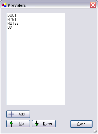 In the Main Menu, under Lists | Providers, you can set up your providers. There is a five letter limit for the abbreviations as shown below. They can be shortened versions of the provider's name, as shown, or more generic abbreviations, like Doc1 or Hyg2. The abbreviations can be changed at any time. The order that the providers show on the list below is the order that they will show on various lists throughout the program. You can easily change the order by highlighting a provider and clicking the up or down button. Changing the order does not harm any patient data. If a provider leaves the practice, they can be marked hidden. A provider can never be deleted because that information has been used in other places in the program.