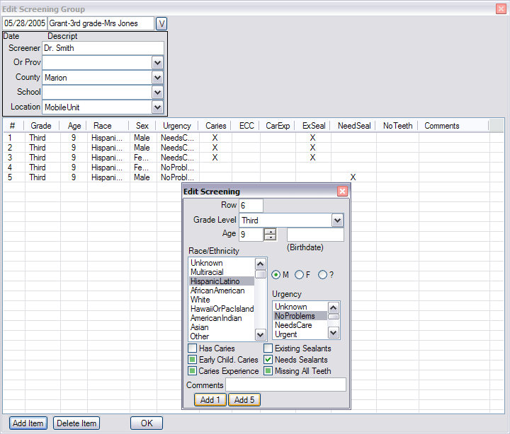 All entry was designed with speed and simplicity in mind. Everything is done with very few clicks and no typing. As you add each child to the list, you only need to make a few changes before entering the next one. All other fields remain the same from child to child. The 6 checkboxes at the bottom have three states: checked, unchecked, and indeterminate (unknown). All fields have unknown as one of the choices so that you only need to enter the fields that are needed by your organization. You don't track the patient names at this point, although you can put the name in the Comments field if you wish. If the patient needs treatment, you may consider entering them into the system as a regular patient and putting their patient ID number in the Comments section. There is still no built-in method for automatically matching a screening patient with a regular patient.