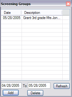 The screen layout may look odd, but that's because it's been designed to eventually fit on a PDA or Palm computer. A screening group is typically a classroom full of children, although it can be as large as an entire school. The screener and the location must be the same for the entire group. If you revisit the same school later, it is considered a separate group because it has a different date. Add a group and add items to the group as shown below.